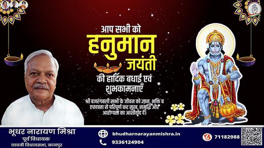 सनातन धर्म के शास्त्रों के अनुसार राम भक्त हनुमान को कलयुग का देवता माना गया है, कहा जाता है कि कलिकाल में भगवान हनुमान साक्षात उपस्थित हैं और अपने भक्तों को दर्शन देकर उनके जीवन की बाधाओं का नाश करते हैं। साथ ही कहा जाता है कि इनका पूजन करने से नकरतमल ऊर्जा और प्रेत-बाधा इत्यादि से भी मुक्ति मिलती है। आप सभी राष्ट्रवासियों को हनुमान जयंती के मंगल अवसर पर असीम शुभकामनाएं, ईश्वर आप सभी के जीवन में उत्तम स्वास्थ्य, समृद्धि और नवऊर्जा का संचार कर मांगल्य लायें।