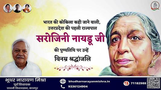 भूधर नारायण मिश्रा- सरोजिनी नायडू जी की पुण्यतिथि पर विनम्र श्रद्धांजलि