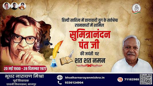 भूधर नारायण मिश्रा-सुमित्रानंदन पंत जी की पुण्यतिथि पर विनम्र श्रद्धांजलि